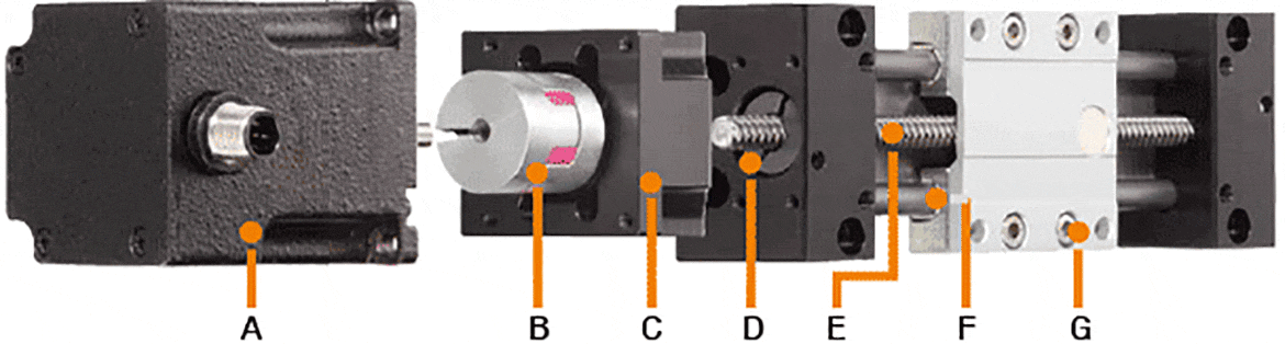 Đệm, bích động cơ và ghép nối nhờ kết hợp đúng giữa bàn tuyến tính và động cơ.