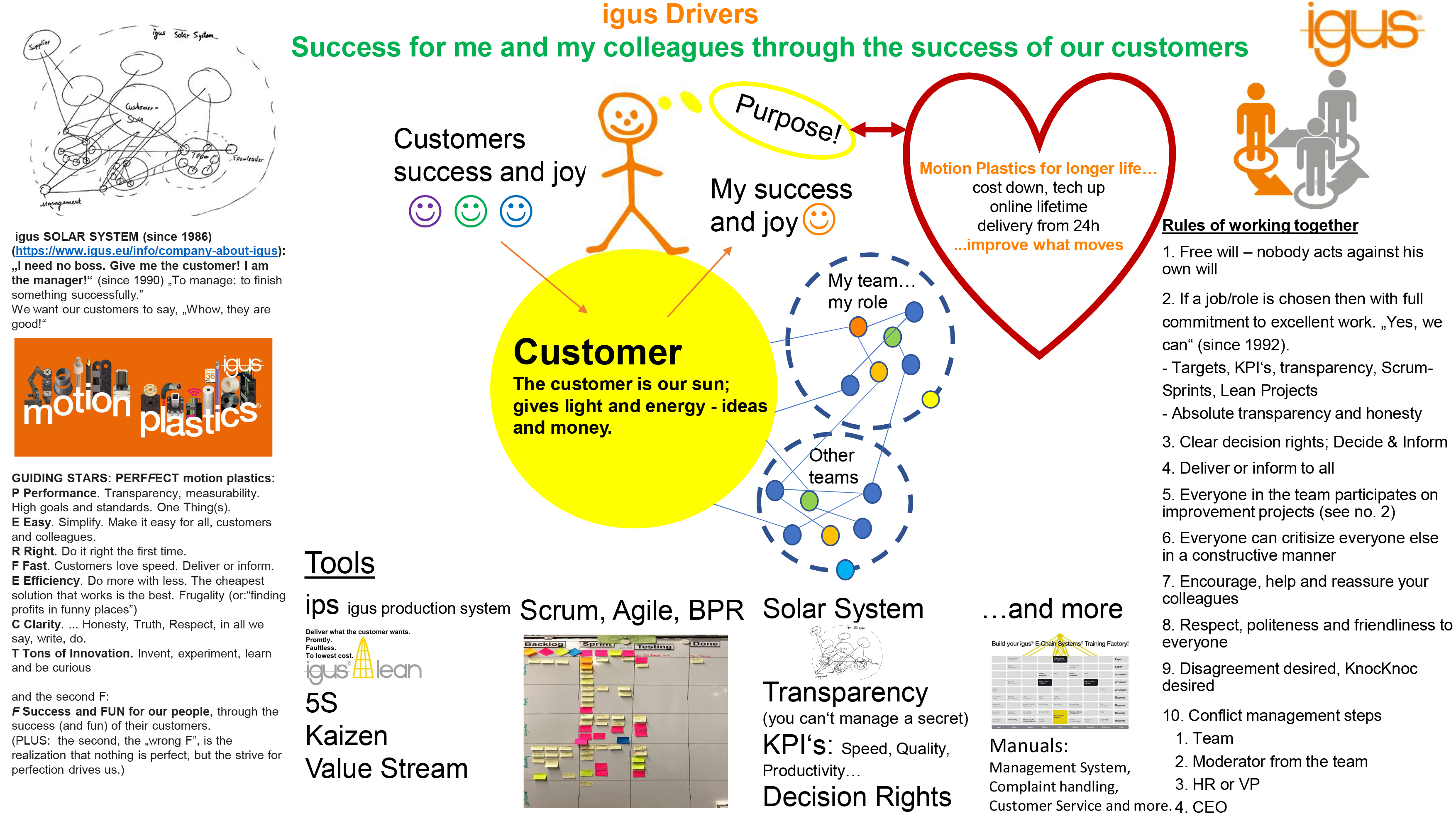 Tại igus, khách hàng nằm ở trung tâm của mọi hoạt động. Đối với chúng tôi, khách hàng quan trọng như mặt trời đối với sự sống trên trái dất: đó là nguồn ánh sáng, nhiệt và năng lượng. Khách hàng cho chúng tôi ý tưởng và công việc để giúp chúng tôi tăng trưởng tiến bộ. "Hệ mặt trời igus" nằm sâu chắc chắn trong triết lý công ty của chúng tôi. Các nhân viên và đội ngũ xoay quanh khách hàng như những hành tinh, ghi nhận mong ước của họ và tìm kiếm giải pháp cho các vấn đề của họ. Chúng tôi hài lòng khi khách hàng hài lòng.