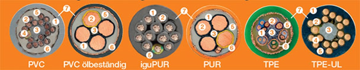 Control cables, Motorcables, Servo cables, Measuring system cables, Fibre optic cables, Koaxcables, Profibus, Ethernet, Profinet, USB, DeviceNet, CC-Link, ROHS, DESINA, CE, UL, CSA, Cleanroom, 30V, 300V, 600V, 1000V …